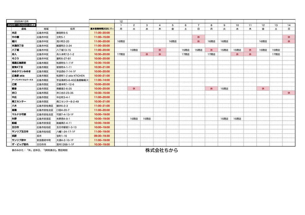 2025/11/28 2025年12月前半の営業日・店休日をお知らせします 2025年12月前半の「ちから」各店の営業カレンダーをお知らせいたします。 2025年12月「ちから」各店営業カレンダー(前半) 202512前半 カレンダー.pdf PDFファイル 90.1 KB ダウンロード tagPlaceholderカテゴリ: 営業カレンダー